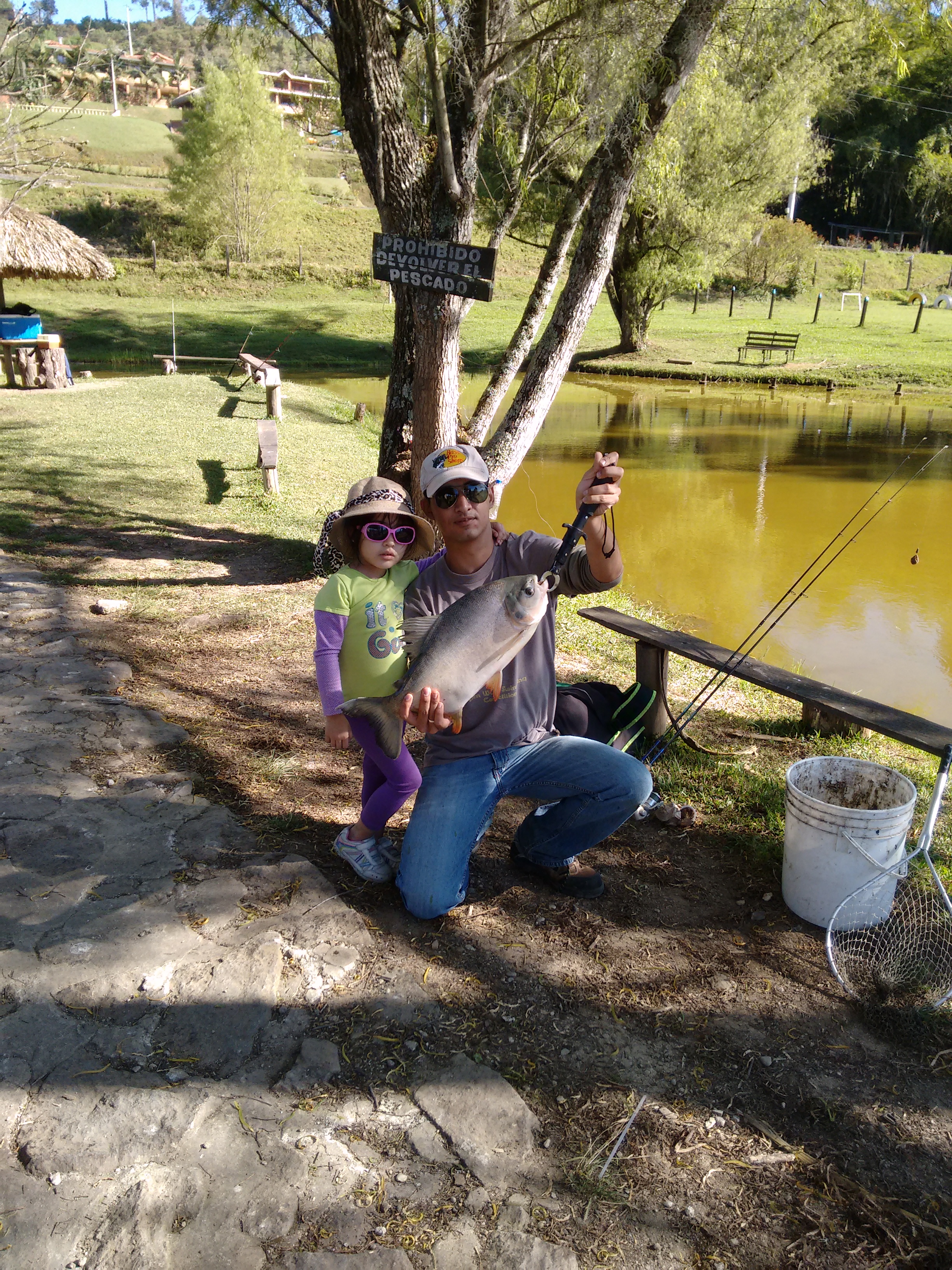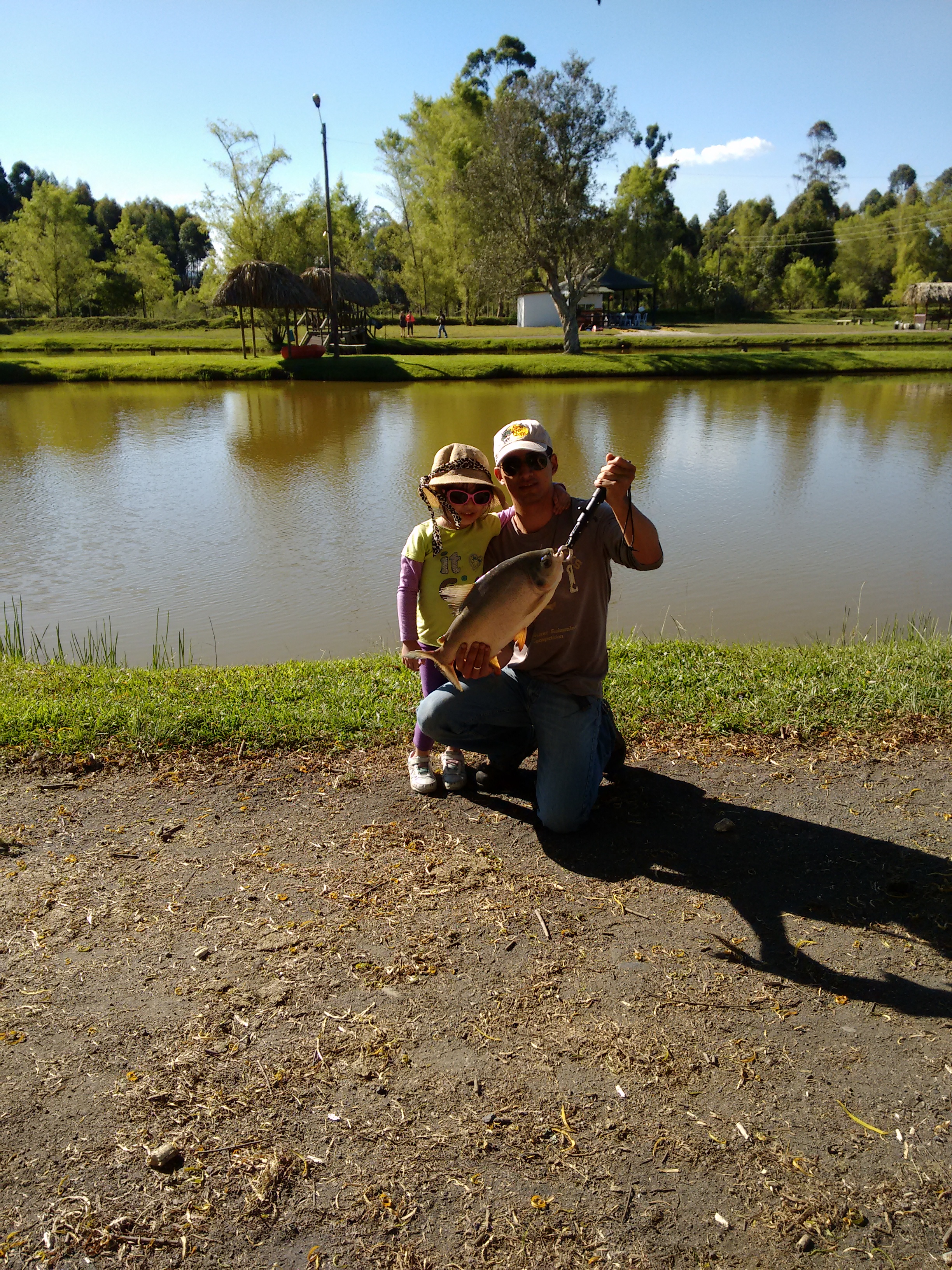 El día inició con un fuerte pique en la vara de valeria, quien ya sabia que debía chuzar y recoger la linea para traer el pez, no sabia si reírse o gritar porque el pez tenia mucha fuerza y no se dejaba traer, finalmente una cachama emergió, quedando así como la primer captura de su vida.