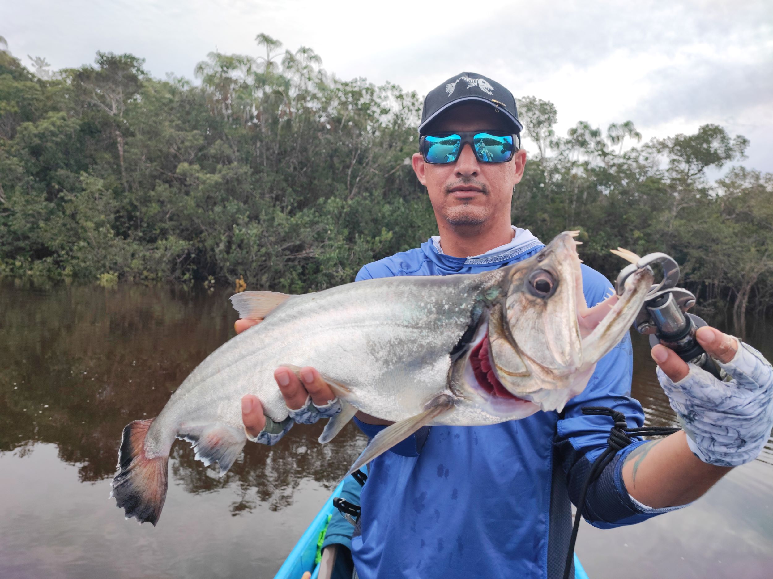 Esta vez, logré capturar una payara de 18 libras y 92 cm, la más grande que he conseguido hasta ahora, lo que me llenó de alegría. Más tarde, Daniel, uno de mis compañeros, enganchó un tucunaré en un nido y, tras una tremenda pelea, logró subirlo al bote y liberarlo.