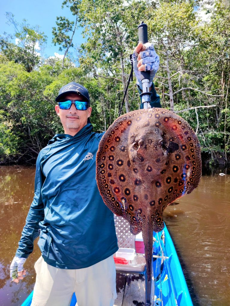 La semana continuó con más sorpresas. Mientras buscaba bagres, capturé una raya de río manchada, un hermoso animal que dio bastante pelea antes de ser liberado de nuevo en el río.