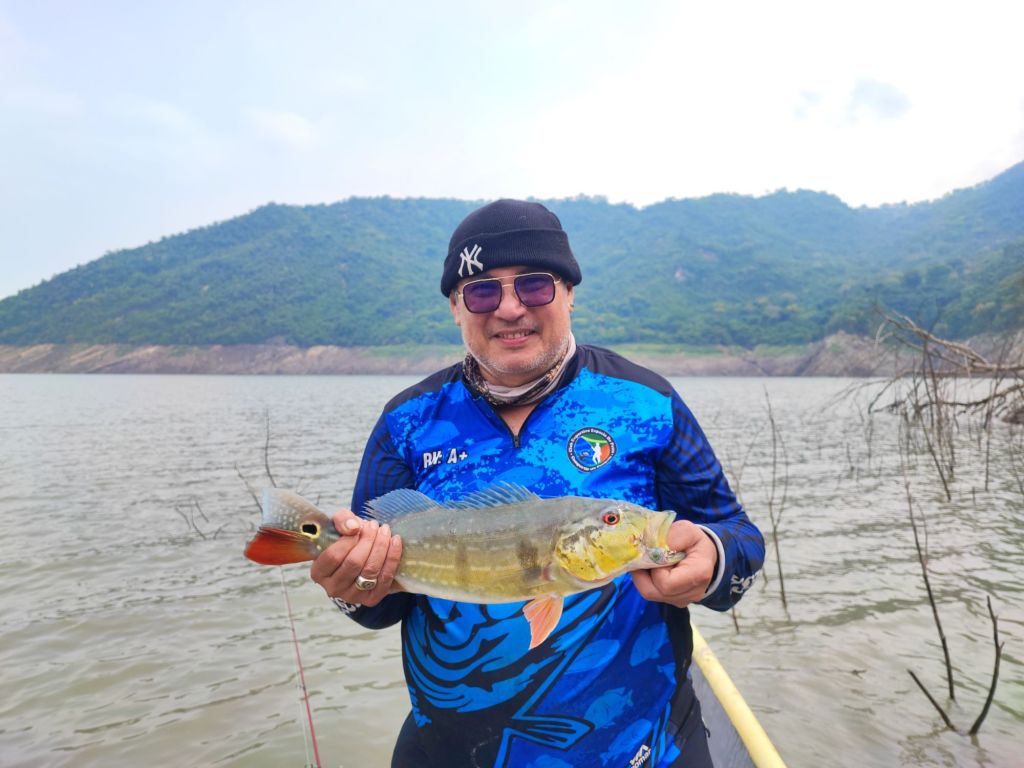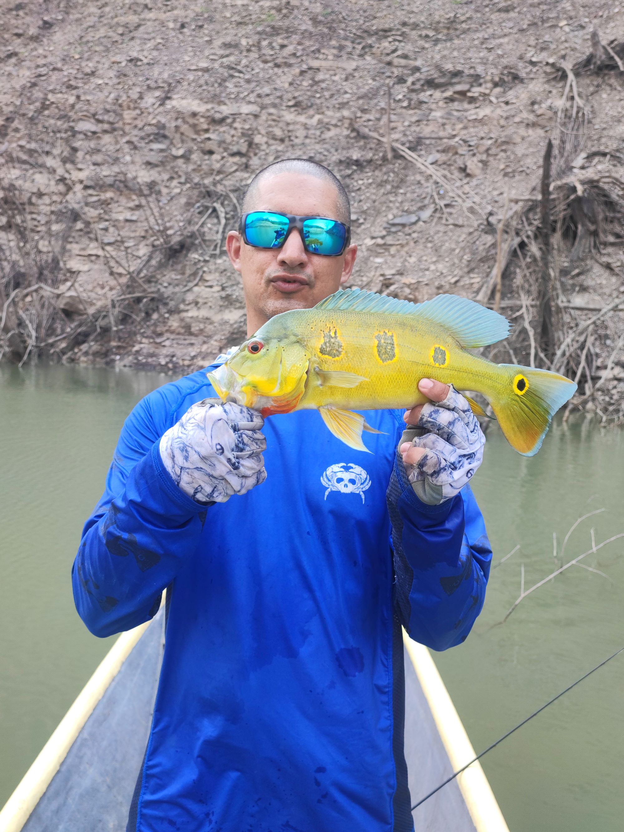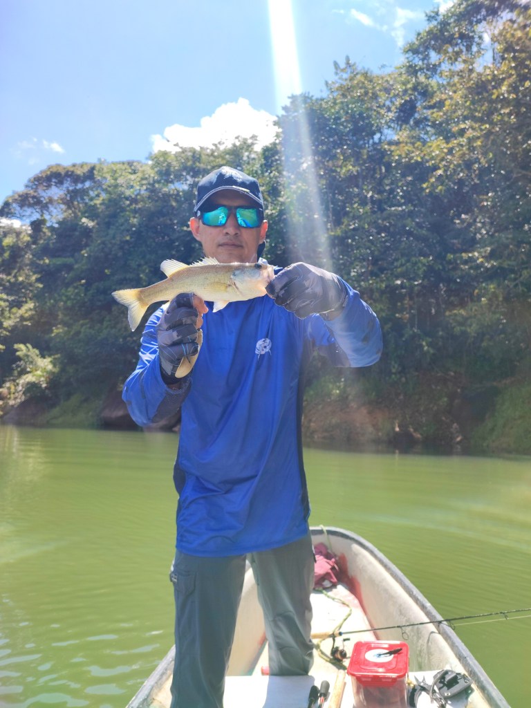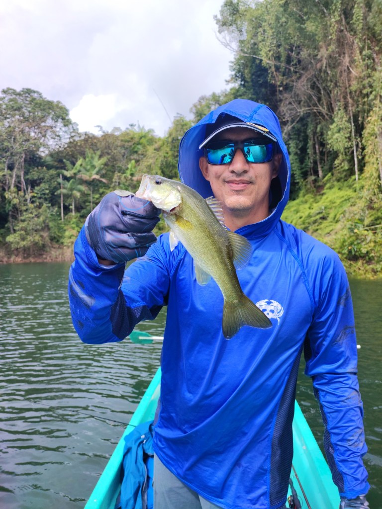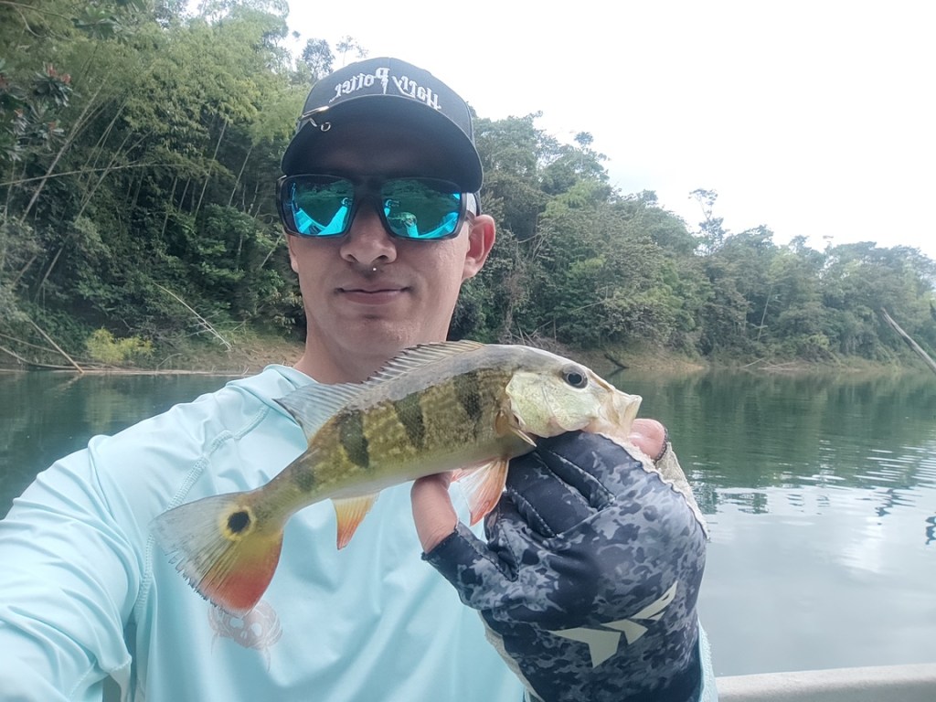 Mi primera gran salida tuvo lugar en marzo, cuando por fin pude dedicar un par de días al Embalse Topocoro, situado a aproximadamente hora y media de Bucaramanga. Este imponente cuerpo de agua, con cerca de 7.000 hectáreas, está rodeado por la Serranía de los Yariguíes, que alberga especies tan magníficas como jaguares, pumas y tigrillos. El calor de esa temporada seca en Colombia había disminuido drásticamente el nivel del embalse, lo que complicó bastante la pesca. Aun así, esos días no perdieron su encanto: recorrí en bote varias orillas y puntos de profundidad media en busca de tucunarés. Recuerdo la emoción de ver el sol reflejándose en la superficie mientras lanzaba mis señuelos, esperando ese tirón inconfundible. Tras varios ataques y suertes fallidas, logré la captura de un tucunaré en el segundo día; fue un momento breve pero intenso, justo lo necesario para hacer que toda la espera valiera la pena. El Topocoro, con sus paisajes y desafíos, se convirtió en un inicio de temporada inolvidable.