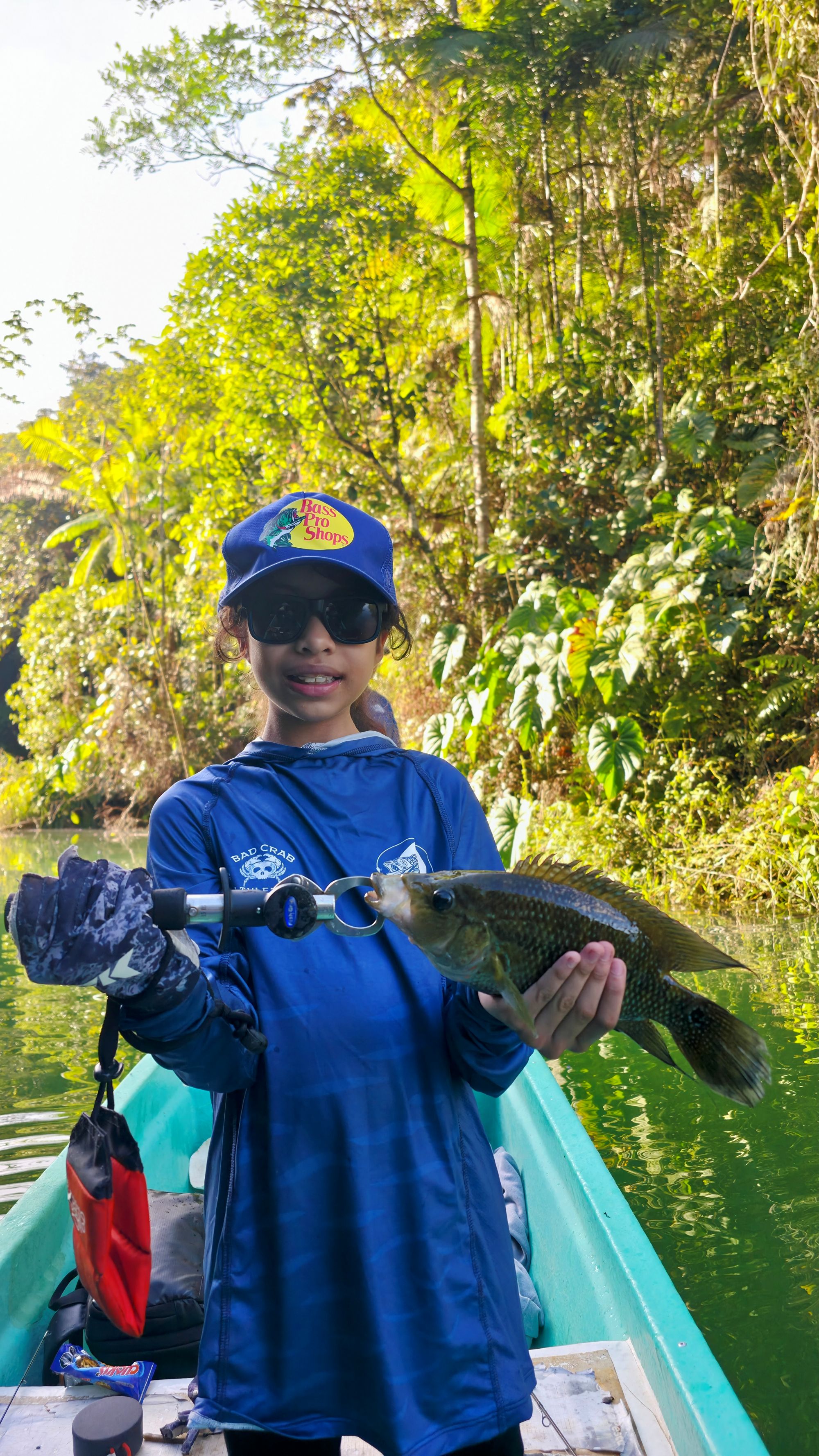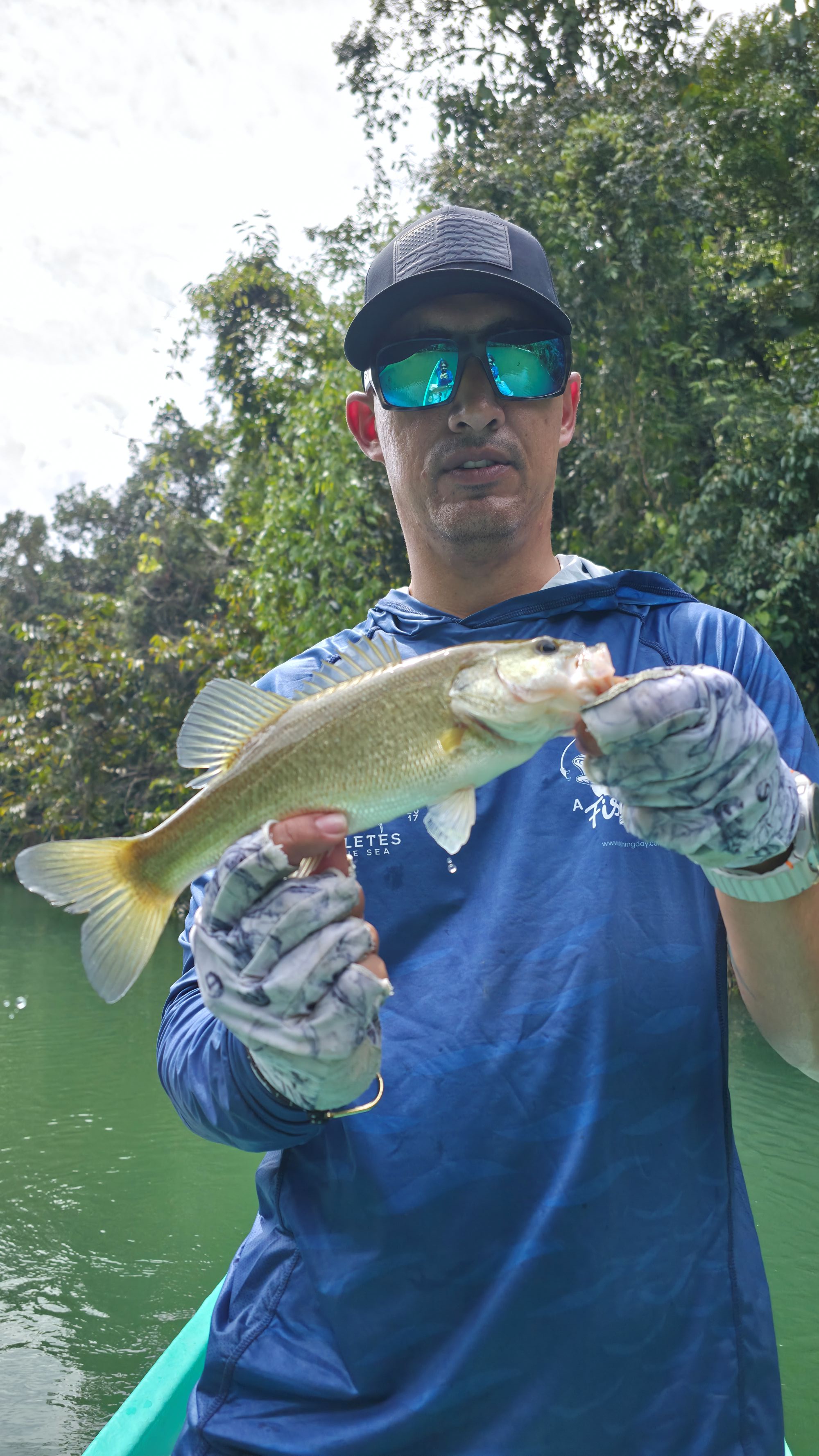 No era un Bass pequeño. La caña se arqueó y comenzó una pelea rápida pero intensa. Al acercar la captura al bote, vimos el brillo azul: ¡Una hermosa Mojarra!…. Reaccioné rápido con la nasa para asegurar el trofeo.